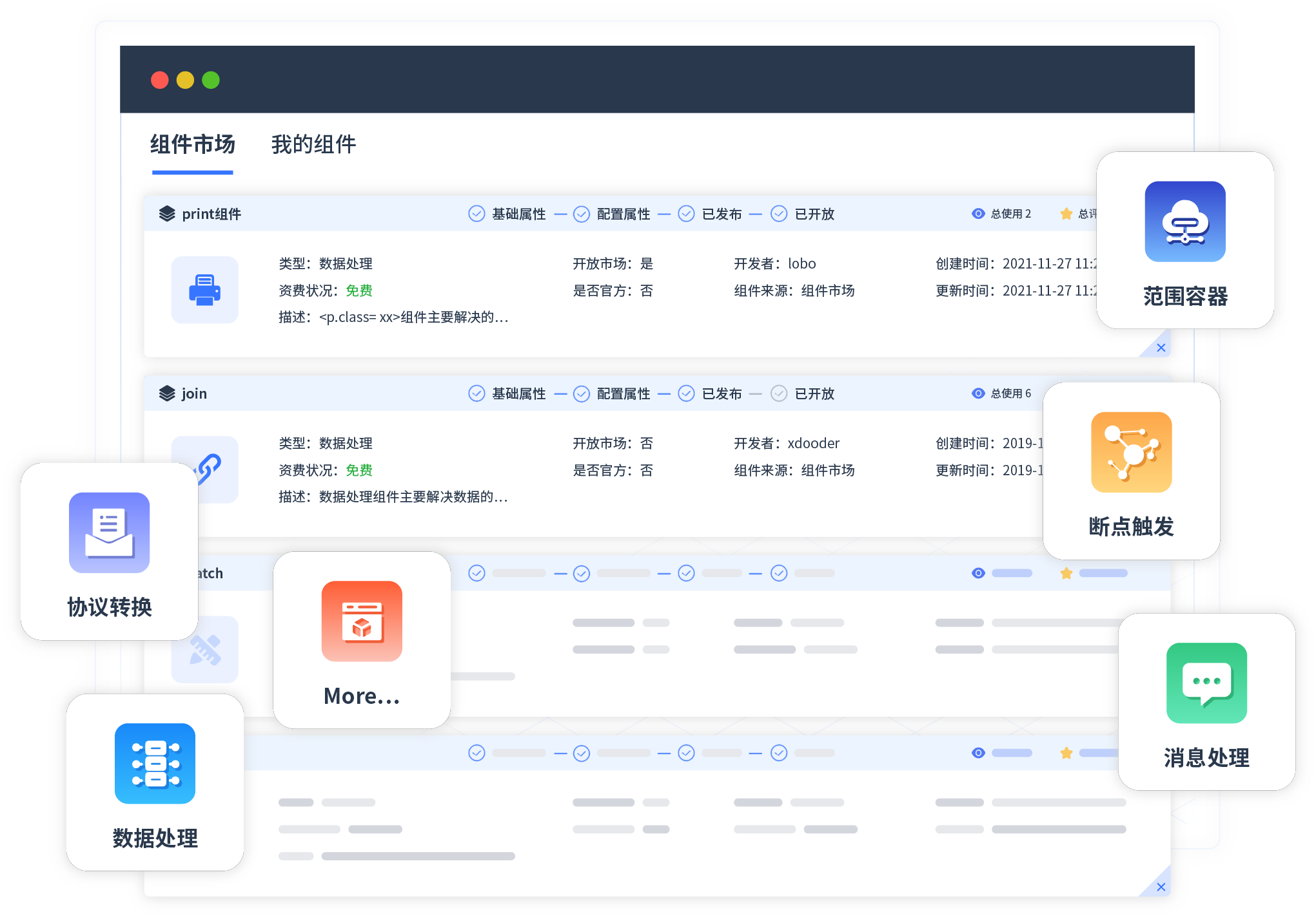 针对集成场景,,,NOPAY钱包提供组件市场,,,例如协议转换、、、消息处理、、、文件操作等。。。除平台提供的组件外,,,客户可以自定义所需组件。。。